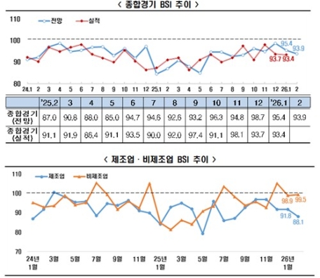 2월 BSI 전망치는 2022년 4월(99.1) 이후 47개월 연속 기준선인 100을 하회했다. 업종별로는 제조업과 비제조업 모두 기준선을 밑돌며 동반 부진을 이어갔지만, 지수 흐름은 엇갈렸다.