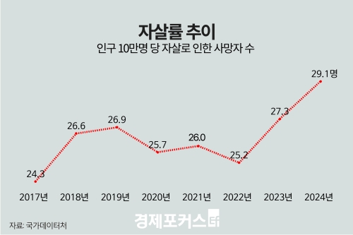 자살률은 상승세를 보였다. 2024년 자살률은 인구 10만 명당 29.1명으로 전년보다 1.8명 증가해 2년 연속 늘었다. 이는 역대 최고치였던 2011년(31.7명) 이후 가장 높은 수준이다. 성별로는 남자가 41.8명으로 여자(16.6명)의 두 배 이상이었다.
