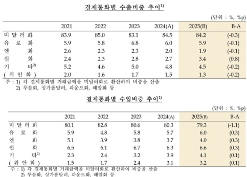 지난해 국제 유가 하락과 미국의 관세 정책 변화 등 대외 여건 변동 속에서 우리 무역의 달러화 결제 비중은 낮아진 반면, 원화 결제 비중은 수출입 모두에서 확대된 것으로 나타났다.