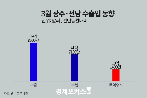 15일 광주본부세관이 발표한 ‘3월 광주·전남지역 수출입 현황’에 따르면 수출은 전년 동월 대비 31.7% 증가한 59억8500만 달러, 수입은 33.5% 늘어난 41억7100만 달러로 집계됐다. 무역수지는 18억1400만 달러 흑자로, 전년 동월(14억1900만 달러)보다 27.8% 증가했다.