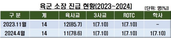 군 당국에 따르면, 지난 4월 장성급 장교 진급 시 육군 소장으로 진급한 장성 14명 중 육사 출신이 11명으로 78.6%에 달했지만, 3사·학군·학사는 각 1명에 불과하다.