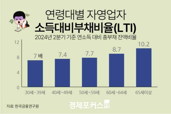 또 개인사업자대출과 가계대출을 포괄해 연 소득 대비 총부채 잔액 비율(LTI)을 계산해본 결과, 연령대가 높을수록 평균 LTI가 높게 나타났다. 특히 65세 이상 자영업 차주의 LTI 평균은 10.2배로 전체 자영업 차주 평균(8.0배)을 웃돌았다.
