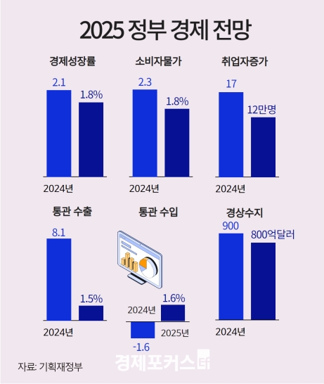 정부는 2일 발표한 '2025년 경제정책방향'에서 올해 한국의 실질 국내총생산(GDP)이 전년대비 1.8% 성장할 것으로 전망했다. 이는 지난해 발표한 기존 전망치(2.2%)에서 0.4%p 낮춘 규모다.