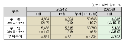 주요 수출 품목 중 반도체(-2.1%), 승용차(-23.2%), 철강제품(-12.8%), 무선통신기기(-30.0%)가 부진했으나, 의약품은 34.4% 증가하며 선전했다. 승용차 수출은 신차(-41.7%)가 크게 줄었지만, 중고차(32.3%)가 증가하면서 전체 감소폭을 일부 상쇄했다.