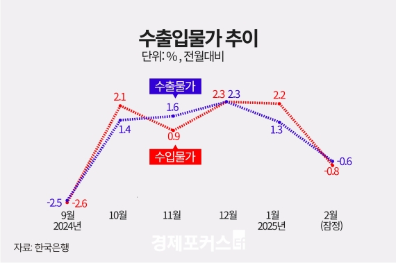 한국은행이 14일 발표한 수출입물가지수 통계에 따르면 2월 수입물가지수(원화 기준, 2020년 수준 100)는 143.95로, 1월보다 0.8% 떨어졌다. 수입물가지수는 지난해 10월부터 계속 상승하다가 2월 들어 하락 전환했다.
