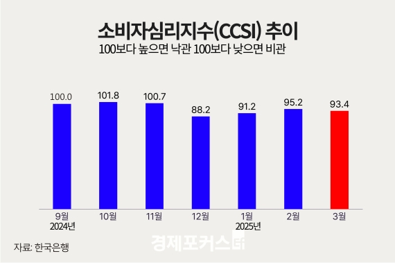 한국은행이 25일 발표한 '2025년 3월 소비자동향조사'에 따르면, 3월 소비자심리지수(CCSI)는 93.4로 전월 대비 1.8포인트(p)하락했다. CCSI는 소비자동향지수(CSI)의 6개 주요 지표를 바탕으로 산출된 심리지표로, 기준값 100을 기준으로 100보다 크면 낙관적, 100보다 작으면 비관적인 소비 심리를 나타낸다.