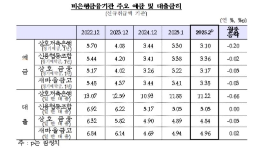 대출금리는 금융기관별로 엇갈렸다. 상호저축은행(11.22%)과 상호금융(4.84%)은 각각 0.66%p, 0.05%p 내렸지만, 새마을금고(4.96%)는 0.02%p 상승했다. 신용협동조합(5.05%) 대출금리는 변동이 없었다.