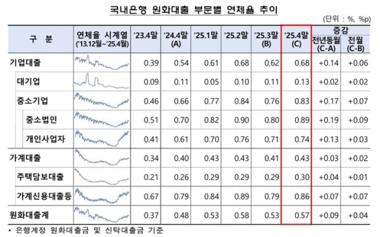 부문별로 보면 기업대출 연체율은 0.68%로 전달 대비 0.06%p 상승했다. 이 가운데 대기업 대출 연체율은 0.13%로 소폭(0.02%p) 증가했으나, 중소기업 대출 연체율은 0.83%로 0.07%p 상승하며 뚜렷한 오름세를 나타냈다. 특히 중소법인의 연체율은 0.89%로, 전달보다 0.09%p 올라 전 부문 중 가장 큰 증가폭을 보였다. 개인사업자 대출 연체율도 0.74%로 0.03%p 상승했다.