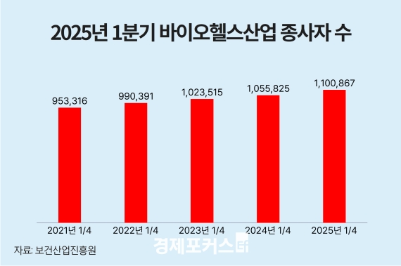 한국보건산업진흥원이 발표한 2025년 1분기 고용 동향에 따르면, 바이오헬스 종사자는 110만867명으로 작년 같은 기간보다 4.3% 증가했으며, 전체 산업 종사자 증가율은 1.0%였다.
