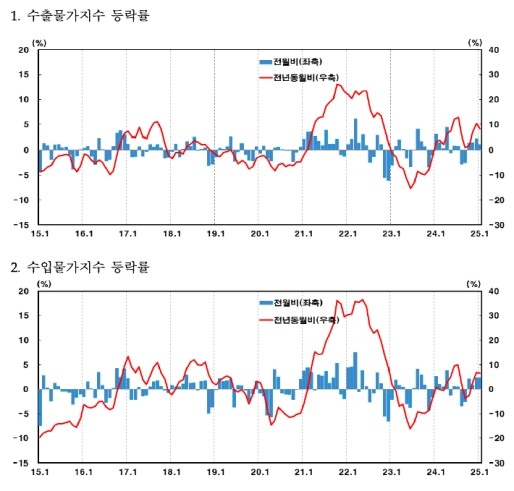 1월 수출물가지수(원화 기준)도 전월 대비 1.2% 상승한 135.12를 기록하며 수입물가와 마찬가지로 4개월 연속 상승세를 이어갔다. 수출물가는 달러-원 환율 상승 속에 석탄 및 석유제품, 화학제품 등 공산품이 1.2% 오른 반면, 농림수산품은 0.8% 하락했다. 계약통화 기준으로는 전월 대비 0.1% 하락했고, 전년 동월 대비로도 0.5% 내렸다.