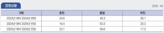 IBK기업은행이 28일 발표한 ‘2025년 중소기업 금융실태조사’에 따르면, 내년 경영 상황이 올해보다 호전될 것이라는 응답은 23.1%로, 지난해 같은 조사(16.4%)보다 6.7%포인트(p) 증가했다. 경영상황이 나빠질 것이라는 응답은 17.3%로 지난해(20.3%)보다 소폭 감소했다. ‘비슷할 것’이라는 응답은 63.3%에서 59.6%로 줄었다.
