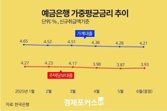 한국은행이 30일 발표한 ‘6월 금융기관 가중평균금리’에 따르면, 예금은행의 신규 가계대출 평균금리는 연 4.21%로 전월보다 0.05%포인트(p) 하락하며 7개월 연속 내림세를 이어갔다. 반면, 주택담보대출(주담대) 금리는 3.93%로 0.06%p 상승하며 5개월 만에 다시 오름세로 돌아섰고, 전세자금대출 금리(3.71%) 역시 0.01%p 올라 7개월 만에 상승 전환했다.
