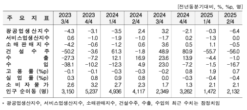 소매판매는 승용차·연료소매점(4.8%)이 늘었으나, 슈퍼마켓·잡화점·편의점(-3.8%), 전문소매점(-1.9%)이 줄어 0.5% 감소했다. 건설수주는 발전·송전 등 토목(43.9%)이 늘었지만, 주택 등 건축(-81.6%)이 급감해 56.0% 감소했다.