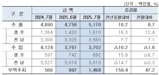 광주지역 7월 수출은 전년 동월 대비 16.3% 증가한 16억1000만 달러, 수입은 15.9% 증가한 6억9200만 달러로 나타났다. 이에 따라 무역수지는 9억1800만 달러 흑자를 기록했다.