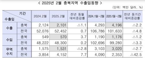 16일 청주세관이 발표한 2025년 2월 수출입동향에 따르면 충북 수출은 21억100만 달러, 수입은 5억7000만 달러로 집계됐다. 무역수지는 15억3100만 달러 흑자를 기록했지만, 지난해 같은 달(15억7500만 달러)보다 2.8% 감소했다. 지난 1월(-2.6%)에 이어 두 달 연속 흑자 규모가 축소된 것이다.