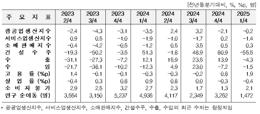 수출은 컴퓨터 주변기기(19.6%), 프로세서·컨트롤러(8.3%) 등이 늘었으나, 경유(-27.8%), 메모리 반도체(-3.7%) 등이 줄어 전년 동분기 대비 4.3% 감소했다. 수입은 원유(3.6%), 가스(43.9%) 등이 늘었으나, 나프타(-29.2%), 석탄(-12.7%) 등이 줄며 전년 동분기 대비 1.5% 감소했다.