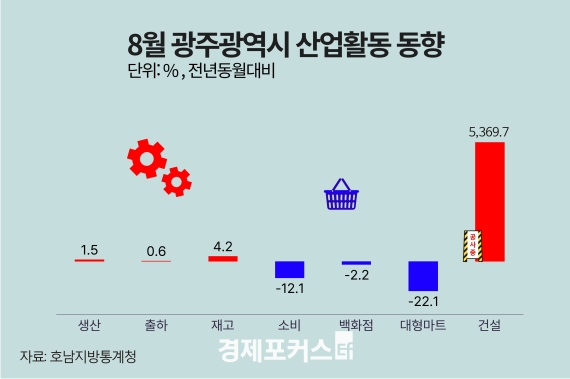 지난달 광주는 광공업이 증가세를 이어가고 건설수주도 급증했지만 소비는 위축됐다. 반면 전남은 광공업과 소비, 건설 모두 부진을 면치 못했다.