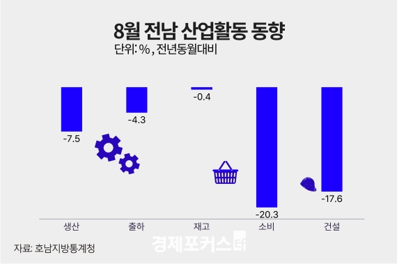 전남은 전반적으로 부진했다. 광공업 생산지수는 99.5로 전년보다 7.5% 감소하며 7개월 연속 마이너스를 기록했다. 화학제품(-4.4%), 전기·가스업(-16.2%), 금속가공(-19.0%) 등 주요 업종이 모두 감소한 것으로 나타났다.