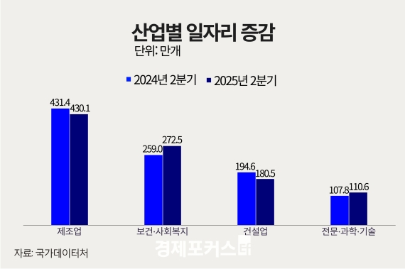 업종별로는 보건·사회복지(13만4000개), 협회·수리·개인(3만개), 전문·과학·기술(2만8000개) 등에서 일자리가 늘었다. 반면 건설업은 14만1000개 감소하며 7개 분기 연속 줄었다. 제조업도 1만3000개 감소해 지난 1분기(-1만2000개)에 이어 2개 분기 연속 감소세를 이어갔다.