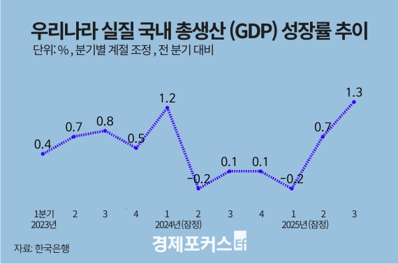 올해 3분기 한국 경제가 내수 회복과 수출 호조에 힘입어 전 분기보다 1.3% 성장했다. 이는 2021년 4분기(1.6%) 이후 15분기 만에 가장 높은 성장률이다.