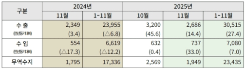국가별 수출은 대만이 10억1000만 달러로 44.0% 증가했으며, 홍콩(2억 달러·40.6%), 베트남(1억3000만 달러·18.6%) 등도 증가했다. 중국 수출은 5억7000만 달러로 12.1% 늘며 한 달 만에 증가 전환한 반면, 미국 수출은 3억3000만 달러로 11.4% 감소해 8개월 연속 감소세를 보였다.