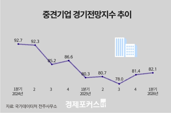 2일 한국중견기업연합회가 발표한 ‘2026년 1분기 중견기업 경기전망조사’에 따르면, 중견기업의 1분기 경기전망지수는 82.1로 집계됐다. 이는 직전 분기보다 0.7포인트(p) 상승한 수치로, 2분기 연속 개선됐지만 기준선인 100에는 미치지 못했다. 이번 조사는 지난해 11월 17일부터 12월 1일까지 중견기업 800개사를 대상으로 진행됐다.