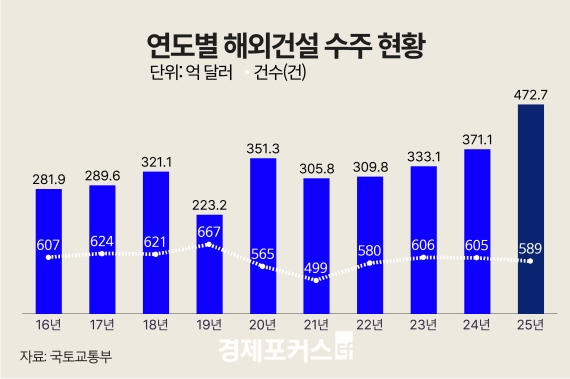 국토교통부는 9일 2025년 해외건설 수주 실적이 472억7000만 달러로 집계됐다고 밝혔다. 이는 2014년(660억 달러) 이후 11년 만의 연간 최대 실적이며, 2015년(461억 달러) 이후 처음으로 400억 달러를 넘어선 수치다. 전년(371억1000만 달러) 대비로는 약 27.4% 증가했다.