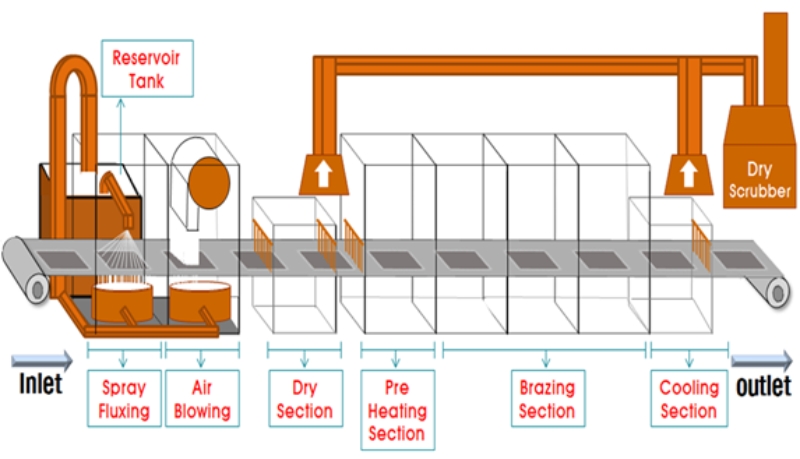 ÀÚµ¿Â÷ÀÇ Aluminum¿±³È¯±â¸¦ ¿¬¼Ó½Ä Brazing Furnace¿¡¼ BrazingÇϱâ À§Çؼ´Â, Aluminum¿±³È¯±â°¡ Brazing FurnaceÀÇ lnlet(ÀÔ±¸)¿¡¼ ¿¬¼ÓÀûÀ¸·Î Outlet(Ãⱸ)ÂÊÀ¸·Î À̵¿µÇ´Âµ¥, À̶§ °øÁ¤º° FluxµµÆ÷, Air Blowing, Drying, Preheating(¿¹¿), Brazing, CoolingµîÀÇ °øÁ¤À» °ÅÃļ ÀÚµ¿Â÷ÀÇ Alumunum ¿±³È¯±â¸¦ »ý»êÇÏ°Ô µÈ´Ù.