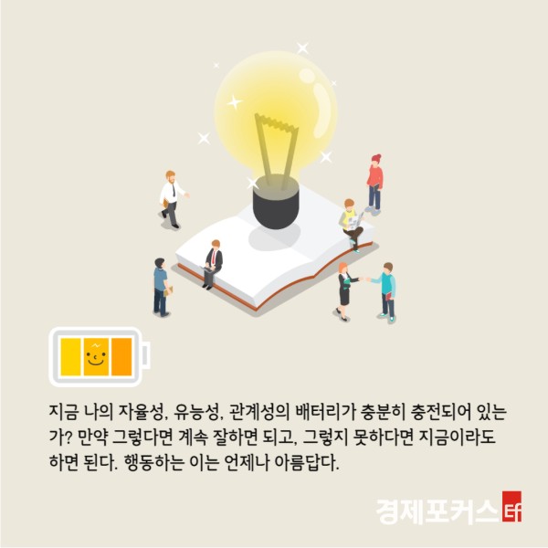 Áö±Ý ³ªÀÇ ÀÚÀ²¼º, À¯´É¼º, °ü°è¼ºÀÇ ¹èÅ͸®°¡ ÃæºÐÈ÷ ÃæÀüµÇ¾î Àִ°¡? ¸¸¾à ±×·¸´Ù¸é °è¼Ó ÀßÇÏ¸é µÇ°í, ±×·¸Áö ¸øÇÏ´Ù¸é Áö±ÝÀÌ¶óµµ ÇÏ¸é µÈ´Ù. ÇൿÇÏ´Â ÀÌ´Â ¾ðÁ¦³ª ¾Æ¸§´ä´Ù.