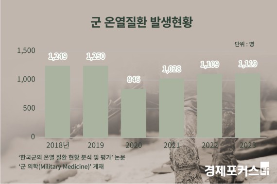 ¿¬±¸ÆÀÀº ±º Àǹ«´ë¿Í ±º º´¿ø¿¡¼­ Ä¡·áÇÑ ¿Â¿­ Áúȯ ȯÀÚ ÇöȲÀ» Áý°èÇß´Ù. 2018³â 1,249¸í, 2019³â 1,250¸í, 2020³â 846¸í, 2021³â 1,028¸í, 2022³â 1,109¸í, 2023³â 1,119¸íÀÌ´Ù.