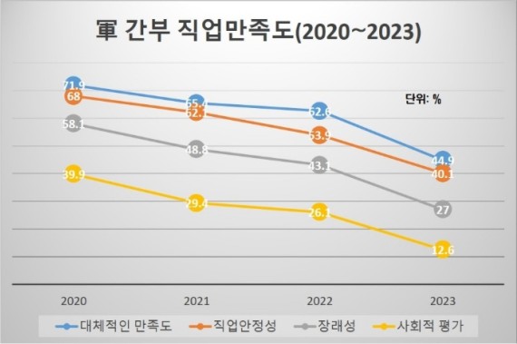 ÏÚ °£ºÎµéÀÇ ±Ø´ÜÀû ¼±ÅÃ(ÀÌÇÏ ÀÚ»ì) ºñÀ²Àº Æò±Õ 60%´ë·Î¼ º´»çµéÀÇ Æò±Õ 30%´ëº¸´Ù ¿ùµîÈ÷ ³ô´Ù. °£ºÎµéÀÇ ÀÚ»ìÀº 2014³â 27°Ç¿¡ ºÒ°úÇßÀ¸³ª, 2021³â 58°Ç, 2023³â¿£ 38°ÇÀ» ±â·ÏÇß´Ù. ¿©±â¿¡ Á÷¾÷¸¸Á·µµ´Â °¥¼ö·Ï ÀúÇÏÇϰí ÀÖ´Ù. Á÷¾÷ ¾ÈÁ¤¼ºÀº 2020³â 68%¿¡¼ 2023³â 40.1%·Î ±Þ°¨Çß°í, Àå·¡¼ºÀº 58.1%¿¡¼ 27.0%·Î ¹Ý Å丷ÀÌ ³µ´Ù.