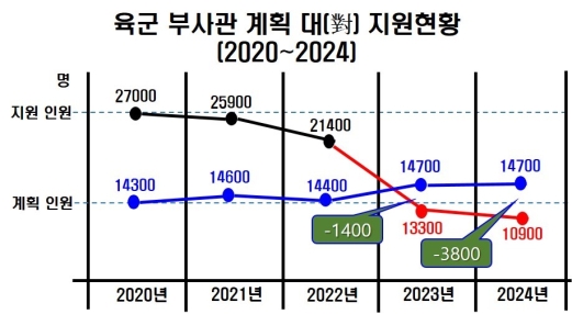 ´ëÇ¥ÀûÀ¸·Î À°±ºÀÇ °æ¿ì, 2022³â±îÁö Áö¿øÀÚ ±Ô¸ð´Â °èȹµÈ Á¤¿ø(ïÒê¬)À» ¿ôµ¹¾Ò´Ù. ±×·¯³ª Á¤Ä¡±Ç¿¡¼ 2023³â º´»ç ¿ù±Þ 200¸¸ ¿ø ½Ã´ë¸¦ °ø¾àÇϸ鼺ÎÅÍ »ó´çÇÑ º¯È°¡ ³ªÅ¸³µ´Ù. À̶§ºÎÅÍ °èȹµÈ Àοø(14700¸í)°ú ºñ±³ÇÒ ¶§ 13300¸í¿¡ ¸Ó¹°¸é¼ -1400¸íÀÌ ºÎÁ·ÇØÁ³´Ù. 2024³â¿£ 10900¸íÀ¸·Î -3800¸íÀÌ ºÎÁ·Çß´Ù.