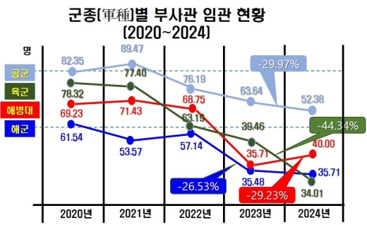 ÃÖ±Ù 5³â°£ À°·ÇØ·°ø±º, ÇØº´´ë¿¡¼ ºÎ»ç°ü ÀÓ°üÀ²ÀÇ Ç϶ô Ãß¼¼°¡ ¶Ñ·ÇÇÏ´Ù. À°±ºÀº 2024³â ÀÓ°üÀ²ÀÌ 2020³â 78.32%¿¡ ºñÇØ -44.34%°¡ °¨¼ÒÇÏ¸é¼ 34.01%¿¡ ºÒ°úÇÏ´Ù. ÇØ±ºÀº -26.53%°¡ °¨¼ÒÇÑ 35.71%, °ø±ºÀº -29.97%°¡ °¨¼ÒÇÑ 52.38%, ÇØº´´ë´Â -29.23%°¡ °¨¼ÒÇÑ 40.00%¿¡ ±×ÃÆ´Ù.