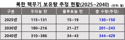 ÀÌ·¯ÇÑ °¡¿îµ¥ Áö³ 26ÀÏ Çѱ¹±¹¹æ¿¬±¸¿ø(ÀÌÇÏ KIDA)ÀÌ ÁÖÃÖÇÑ 2025³â ºÏÇѱº»çÆ÷·³’¿¡¼ ¿ÃÇØ ±âÁØÀ¸·Î ºÏÇÑÀÇ ÇÙ¹«±â ¼ö·®(ÃßÁ¤)ÀÌ »ó´çÈ÷ Áõ°¡µÆ´Ù´Â ÁÖÀåÀÌ Á¦±âµÆ´Ù. ¿ì¶ó´½ÅºÀÌ 115∼131¹ß, Ç÷çÅ䴽źÀº 15∼19¹ß·Î¼ ±âÁ¸ ±¹Á¦ ¿¬±¸±â°üÀÇ ¹ßÇ¥ ¼öÄ¡¿Í ÃÖ´ë +60~+37¹ßÀÌ Â÷À̳ª´Â 130∼150¹ß·Î ¹ßÇ¥ÇØ¼´Ù.