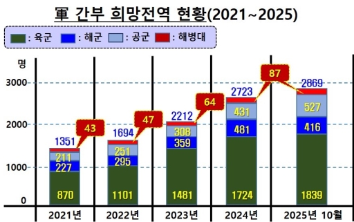 Áö³ 10¿ù ±¹¹æºÎ¿¡¼ °ø°³ÇÑ ‘ÏÚ °£ºÎ Èñ¸Á Àü¿ª ÇöȲ’À» »ìÆìº¸¸é, ÃÖ±Ù 5³â°£ Á¤³â Àü¿ª ÀÌÀü(ì¤îñ)¿¡ Èñ¸Á Àü¿ªÀ» ½ÅûÇÑ À§·¿µ°ü Àå±³¿Í ºÎ»ç°üÀº ÃÑ 2869¸íÀÌ´Ù. 2021³âµµ¿¡ ºñÇØ ¾à 2.1¹è°¡ ´Ã¾ú´Ù. ¿ÃÇØ »ó¹Ý±â Á¤³â Àü¿ª ±âȸ°¡ ³²¾Ò´Âµ¥µµ ¸»ÀÌ´Ù.