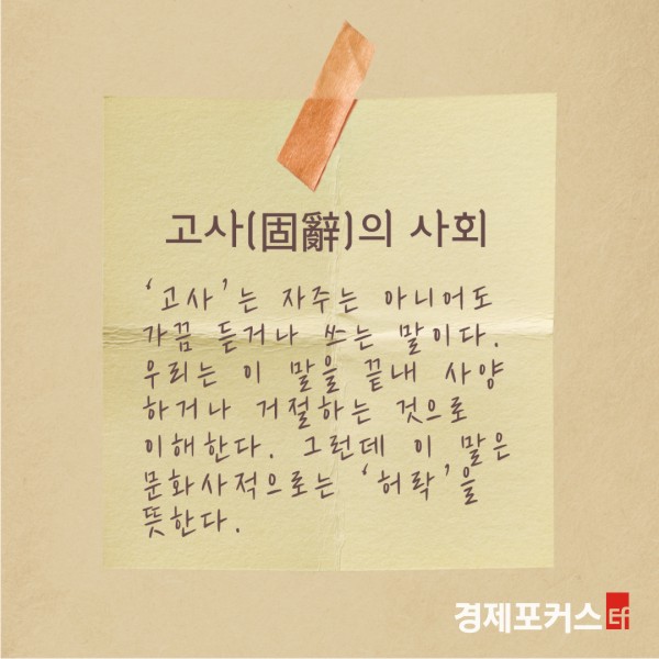 ‘°í¼Ò¿ø(ͳá¶êÃ)’ÀÌ ÁøÁ¤ÇÑ ¹Ù·¥ÀÌµí ‘°í»ç(ͳÞö)’´Â °ÅÁþ ¾Æ´Ñ ÂüµÈ »ç¾çÀÌ´Ù. À̰ÍÀº ‘³ª´Â ÂüÀ¸·Î ±×°ÍÀ» °¨´çÇÒ ¼ö ¾ø½À´Ï´Ù. ÀÚ°ÝÀÌ ºÎÁ·ÇÕ´Ï´Ù.’¶ó´Â ÁÖ°üÀû Àνİú ŵµ¿¡¼ ³ª¿Â ÇàÀ§ÀÌ´Ù. ±×·¡µµ »óȲÀÌ ¿äûÇÏ¸é °¨´çÇØ¾ß Çϱ⿡ °í»çÇÏÁö¸¸ ÀÀ³«ÇÏ´Â °ÍÀÌ´Ù. À¯ºñ°¡ Á¦°¥·® ã¾Æ°£ °ÍÀ» »ï°íÃÊ·Á(ß²ÍÓõ®Õæ)¶ó°í Çϴµ¥ »ï°í(ß²ÍÓ)´Â ¼¼ ¹ø ¿äûÇÑ °ÍÀ̰í Á¦°¥·®Àº µÎ ¹ø »ç¾çÇÑ ´ÙÀ½¿¡ ¼ö¿ëÇÑ °ÍÀÌ´Ï ‘°í»ç’°¡ µÈ´Ù.