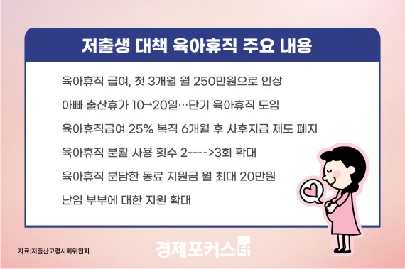 Á¤ºÎ°¡ ÀúÃâ»ý Ãß¼¼¸¦ ¹ÝÀüÇϱâ À§ÇÑ ´ëÃ¥À¸·Î À°¾ÆÈÞÁ÷À» ´õ Àß°Ô Âɰ³ ¾µ ¼ö ÀÖ°Ô ÇÏ´Â ¹æ¾ÈÀ» ÃßÁøÇÑ´Ù. À°¾ÆÈÞÁ÷ ±Þ¿©°¡ ÃÖ´ë ¿ù 250¸¸¿øÀ¸·Î ÀλóµÇ°í ¹è¿ìÀÚ Ãâ»êÈÞ°¡ ±â°£Àº 10ÀÏ¿¡¼ 20ÀÏ·Î ´Ã¾î³´Ù.