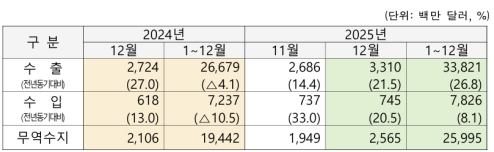 15ÀÏ Ã»ÁÖ¼¼°ü¿¡ µû¸£¸é 2025³â 12¿ù ÃæºÏÀÇ ¼öÃâ¾×Àº 33¾ï1000¸¸ ´Þ·¯·Î Àü³â µ¿¿ù ´ëºñ 21.5% Áõ°¡Çß´Ù. °°Àº ±â°£ ¼öÀÔÀº 7¾ï5000¸¸ ´Þ·¯·Î 20.5% ´Ã¾úÀ¸¸ç, ÀÌ¿¡ µû¶ó ¹«¿ª¼öÁö´Â 25¾ï7000¸¸ ´Þ·¯ ÈæÀÚ¸¦ ±â·ÏÇß´Ù. ¼öÃâÀº 10°³¿ù ¿¬¼Ó, ¼öÀÔÀº 7°³¿ù ¿¬¼Ó Áõ°¡¼¼¸¦ º¸¿´´Ù.