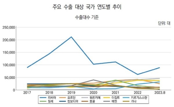 Áö³­ÇØ ±âÁØ ¿ì¸®³ª¶óÀÇ Áß°íÂ÷ ¼öÃâ ´ë»ó ±¹°¡ ¼ö´Â ¸ðµÎ 178°³±¹À¸·Î Áý°èµÆ´Ù. ÇÏÀ̺긮µå Â÷·®À» Æ÷ÇÔÇÑ Áß°í Àü±âÂ÷¿¡ ´ëÇÑ ¼öÃâ ¼ö¿äµµ Áõ°¡ Ãß¼¼·Î, Áö³­ÇØ ¼öÃâµÈ Àü±âÂ÷Á¾Àº ¸ðµÎ 1¸¸2386´ë·Î Áý°èµÆ´Ù.