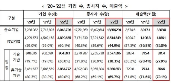 Áö³­ 2022³â ±âÁØ Ã¢¾÷±â¾÷ ¼ö´Â Àü³â ´ëºñ 6.2% Áõ°¡ÇÑ 482¸¸9000°³·Î Àüü Áß¼Ò±â¾÷ÀÇ 60.1%¸¦ Â÷ÁöÇß´Ù. â¾÷±â¾÷ Áß ±â¼ú ±â¹Ý â¾÷±â¾÷Àº 96¸¸5000°³·Î 20.0%¿´´Ù.