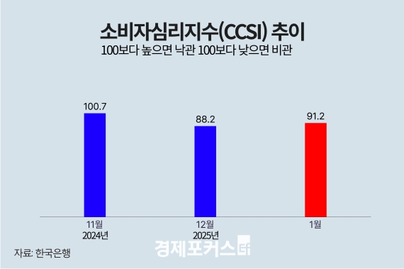 Çѱ¹ÀºÇàÀÌ 22ÀÏ ¹ßÇ¥ÇÑ '¼ÒºñÀÚµ¿ÇâÁ¶»ç °á°ú'¿¡ µû¸£¸é, 1¿ù ¼ÒºñÀڽɸ®Áö¼ö(CCSI)´Â 91.2·Î Áö³­ÇØ 12¿ùº¸´Ù 3.0Æ÷ÀÎÆ®(p) »ó½ÂÇß´Ù. ÀÌ´Â Áö³­ 2023³â 5¿ù ÀÌÈÄ °¡Àå Å« ÆøÀÇ »ó½ÂÀÌÁö¸¸, ¿©ÀüÈ÷ ºñ»ó°è¾ö ÀÌÀü ¼öÁØ¿¡´Â ¹ÌÄ¡Áö ¸øÇÏ´Â ¼öÄ¡´Ù.
