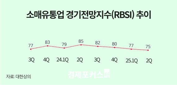 ´ëÇÑ»ó°øÈ¸ÀǼҴ ¹éÈÁ¡, ´ëÇü¸¶Æ®, ÆíÀÇÁ¡, ½´ÆÛ¸¶ÄÏ, ¿Â¶óÀμîÇÎ µî Àü±¹ 500°³ ¼Ò¸ÅÀ¯Åë¾÷ü¸¦ ´ë»óÀ¸·Î ¿ÃÇØ 2ºÐ±â ¼Ò¸ÅÀ¯Åë¾÷ °æ±âÀü¸ÁÁö¼ö(RBSI)¸¦ Á¶»çÇÑ °á°ú, Áö¼ö°¡ 75·Î Áý°èµÆ´Ù°í 8ÀÏ ¹àÇû´Ù. ÀÌ´Â 1ºÐ±â(77)º¸´Ù 2Æ÷ÀÎÆ® Ç϶ôÇÑ ¼öÄ¡´Ù.
