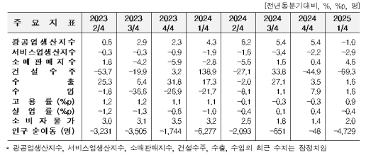 ¿ÃÇØ 1ºÐ±â °æ³² Áö¿ª°æÁ¦´Â ±¤°ø¾÷°ú ¼­ºñ½º¾÷ »ý»êÀÌ ¸ðµÎ ÁÙ¾úÀ¸³ª, ¼Ò¸ÅÆÇ¸Å¿Í ¼öÃâÀÔÀº ¼ÒÆø Áõ°¡ÇÑ °ÍÀ¸·Î ³ªÅ¸³µ´Ù. °Ç¼³¼öÁÖ´Â Å©°Ô ÁÙ¾ú°í, Àα¸´Â û³âÃþ Áß½ÉÀ¸·Î ¼øÀ¯ÃâÀÌ Áö¼ÓµÆ´Ù.