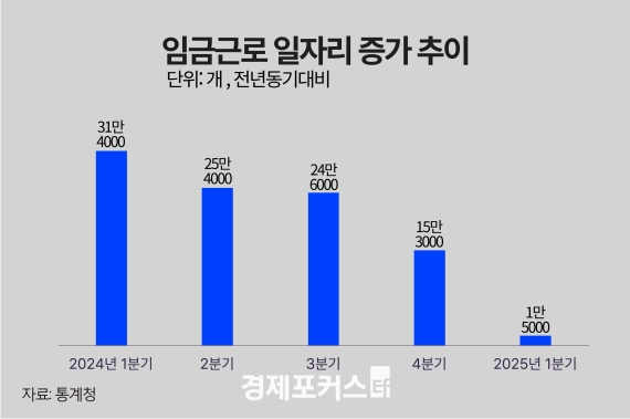 ¿ÃÇØ 1ºÐ±â ÀӱݱٷΠÀÏÀÚ¸® Áõ°¡ ÆøÀº 2024³â 1ºÐ±â(31¸¸4000°³, 1.6%)¿¡ ºñÇØ Å©°Ô µÐȵƴÙ. ÀÌÈÄ 2024³â 2ºÐ±â 25¸¸4000°³, 3ºÐ±â 24¸¸6000°³, 4ºÐ±â 15¸¸3000°³·Î Á¡ÁøÀûÀ¸·Î Ãà¼ÒµÇ¸ç ¿ÃÇØ 1ºÐ±â¿¡´Â 1¸¸5000°³ Áõ°¡¿¡ ±×ÃÄ »ç½Ç»ó Á¤Ã¼ ¼öÁØÀ» º¸¿´´Ù.