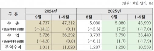 Àü³²ÀÇ 9¿ù ¼öÃâÀº 35¾ï2000¸¸ ´Þ·¯·Î Àü³â ´ëºñ 3.6% °¨¼ÒÇßÀ¸¸ç, ¼öÀÔÀº 29¾ï6000¸¸ ´Þ·¯·Î 5.3% ÁÙ¾ú´Ù. ¹«¿ª¼öÁö´Â 5¾ï6000¸¸ ´Þ·¯ ÈæÀÚ¸¦ ±â·ÏÇß´Ù.