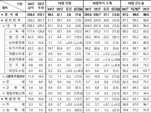 ±âȹÀçÁ¤ºÎ°¡ 28ÀÏ ¹ßÇ¥ÇÑ ‘2025³â 10¿ù ±¹¼¼¼öÀÔ ÇöȲ’¿¡ µû¸£¸é 10¿ù ±¹¼¼¼öÀÔÀº 41Á¶1000¾ï¿øÀ¸·Î Àü³â µ¿¿ù ´ëºñ 2Á¶8000¾ï¿ø Áõ°¡Çß´Ù.