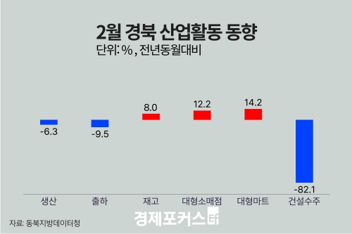 대구와 경북 모두 광공업 생산과 출하가 전년동월대비 감소한 가운데, 대형소매점 판매는 증가했고 건설수주는 큰 폭으로 줄어든 것으로 나타났다.