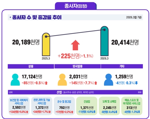 30일 고용노동부가 발표한 ‘2026년 3월 사업체노동력조사’에 따르면 3월 마지막 영업일 기준 종사자 1인 이상 사업체 종사자는 2041만4000명으로 전년 동월보다 22만5000명(1.1%) 증가했다. 이는 2024년 5월 이후 가장 큰 증가 폭이다.