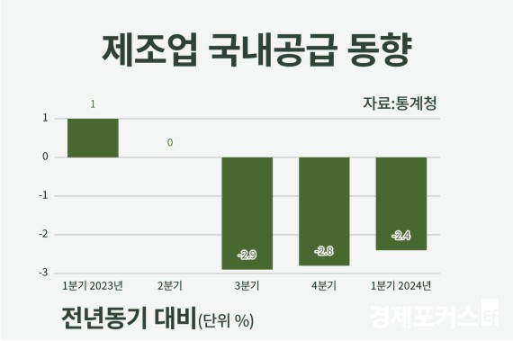 ¿ÃÇØ 1ºÐ±â Á¦Á¶¾÷ Á¦Ç°ÀÇ ±¹³» °ø±ÞÀÌ 1³â Àüº¸´Ù 2.4% °¨¼ÒÇÑ °ÍÀ¸·Î ³ªÅ¸³µ´Ù. ³»¼ö µÐÈ·Î ÀÎÇØ ±¹³» ¼ö¿ä°¡ ÁÙ¸é¼ ±¹»ê°ú ¼öÀÔÀÌ ¸ðµÎ °ø±ÞÀÌ ÁÙ¾î 3°³ ºÐ±â ¿¬¼Ó °¨¼Ò¼¼¸¦ À̾´Ù.