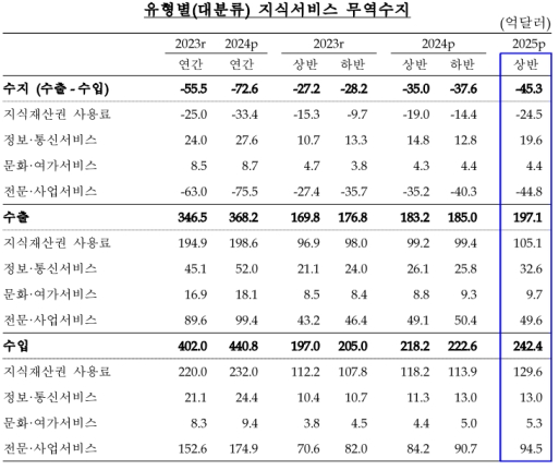 Áö½ÄÀç»ê±Ç ºÎ¹®¿¡¼´Â »ê¾÷Àç»ê±Ç(-17¾ï5000¸¸ ´Þ·¯)°ú »óÇ¥·ÇÁ·£Â÷ÀÌÁî±Ç(-9¾ï9000¸¸ ´Þ·¯), ÀúÀÛ±Ç(-6¾ï ´Þ·¯)¿¡¼ ÀûÀÚ°¡ µÎµå·¯Á³´Ù. ÀÌ´Â Á¦Á¶¾÷üÀÇ ÇØ¿Ü R&D ºñ¿ë Áõ°¡, ±Û·Î¹ú ºê·£µå »óÇ¥±Ç ·Î¿Æ¼ Áö±Þ È®´ë, °³ÀεéÀÇ ÇØ¿Ü ¾Û ±¸¸Å ¹× OTT ±¸µ¶ È®»ê ¶§¹®À̾ú´Ù.